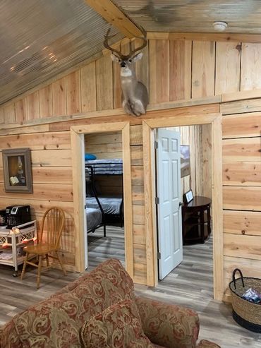 There are two bedrooms. One bedroom has two sets of bunk beds and the other has one queen size bed. This cabin sleeps six.